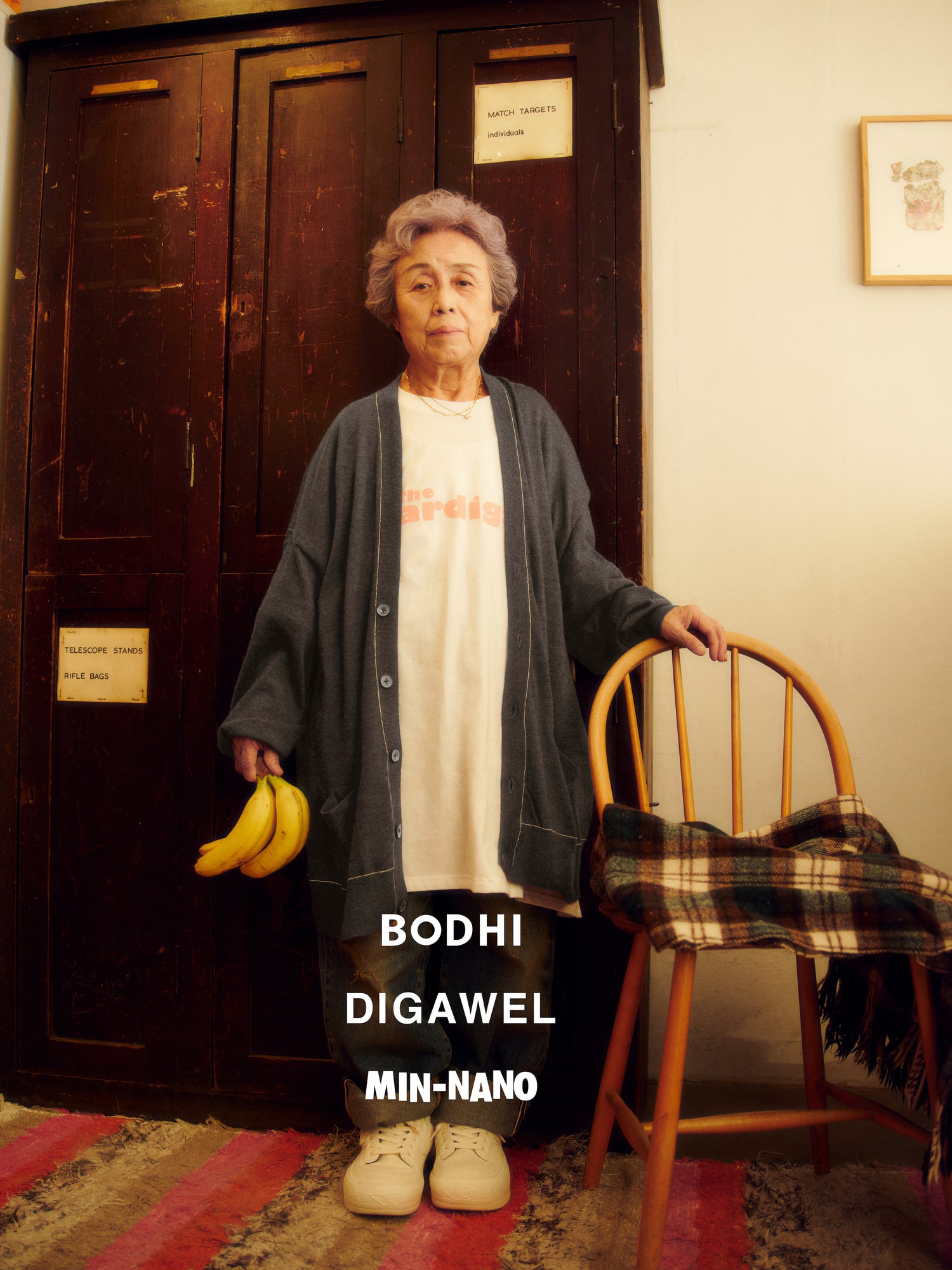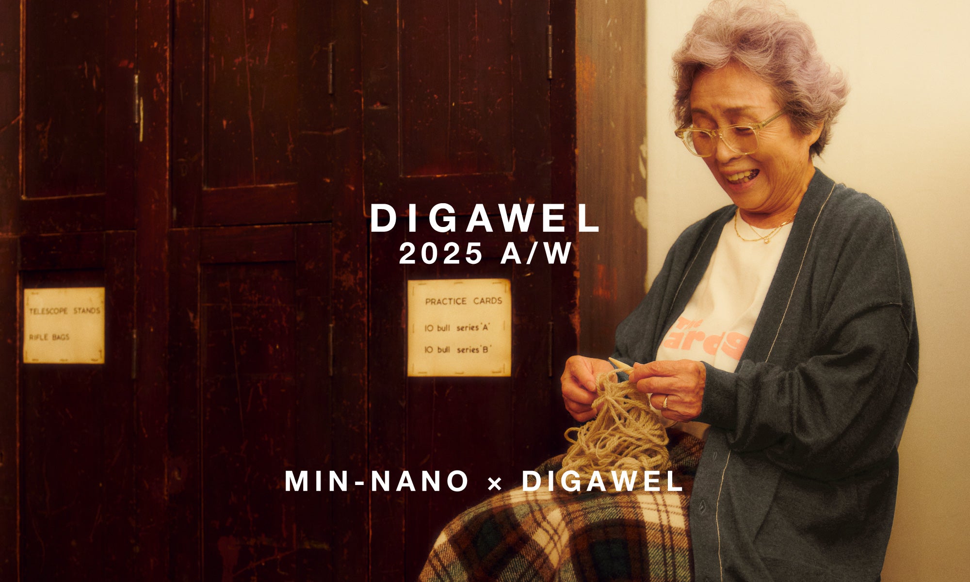 カーディガンに合わせるために作ったThe cardigan T-shirt (MIN-NANO×DIGAWEL)も制作。MIN-NANO別注カラーGray とThe cardigan T-shirt (MIN-NANO×DIGAWEL) は、DIGAWEL1・DIGAEL ONLINE STORE・MIN-NANOのみの限定販売になります。(全国の正規取扱店での販売はございません。)