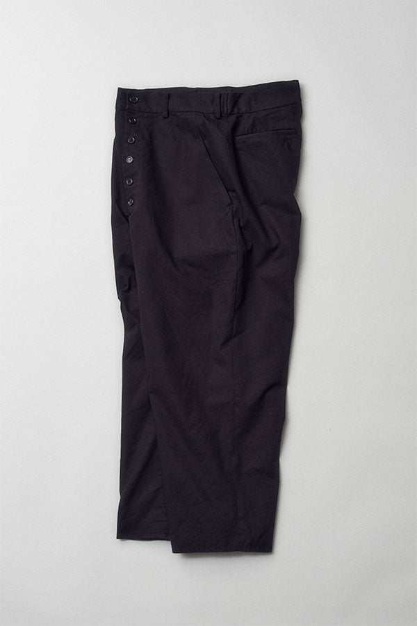 パンツの前立てをボタンで開閉するワイドストレートパンツ。