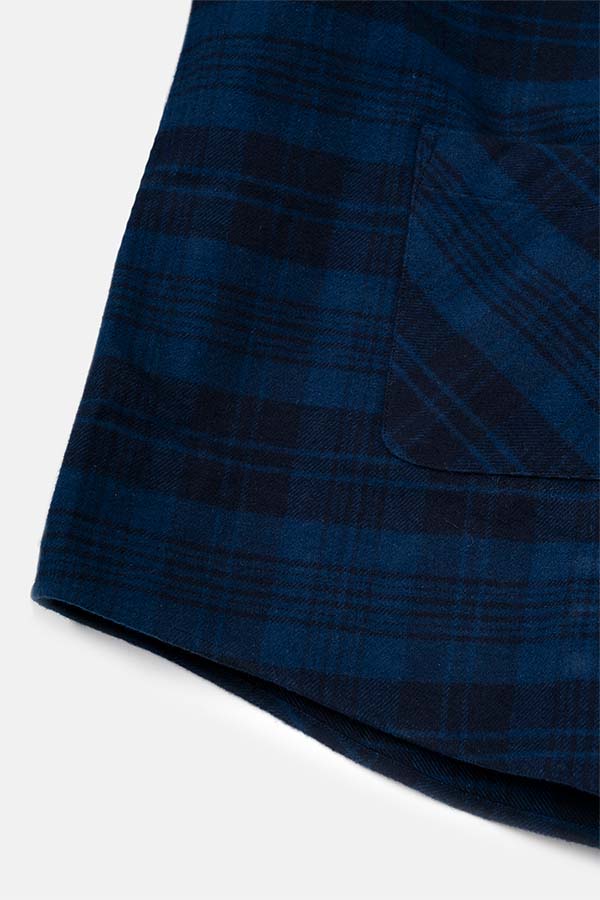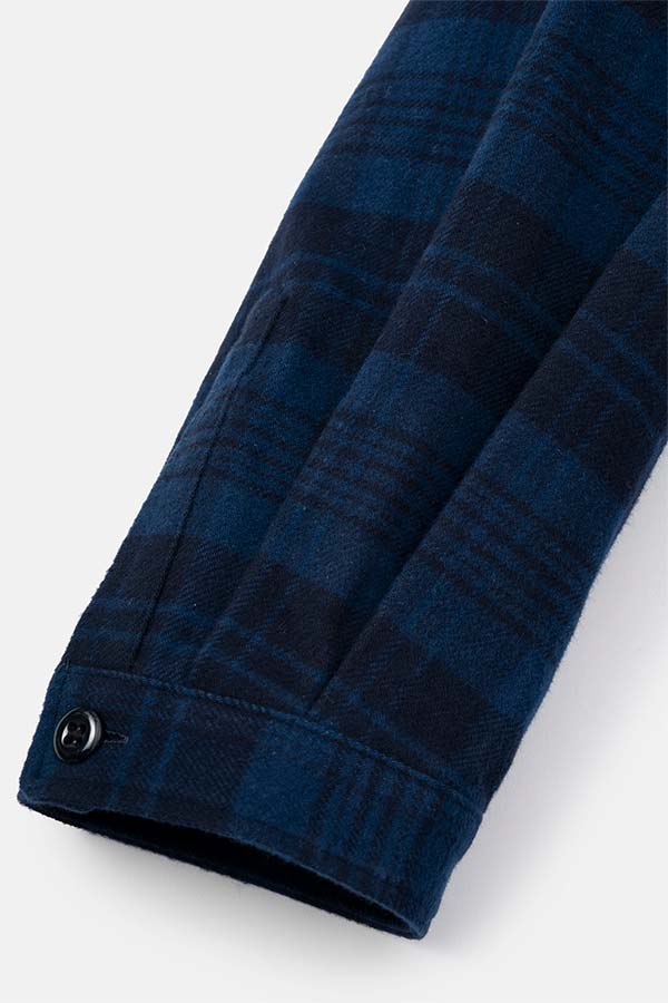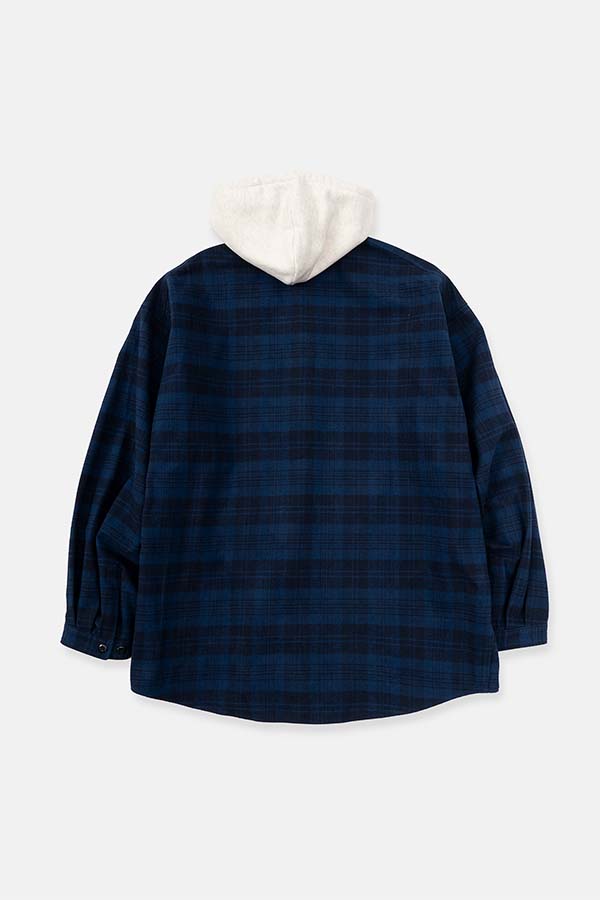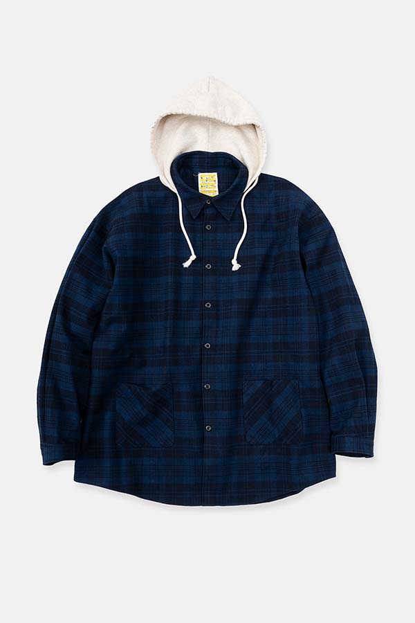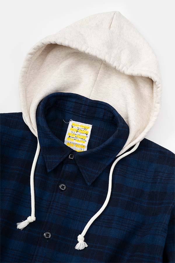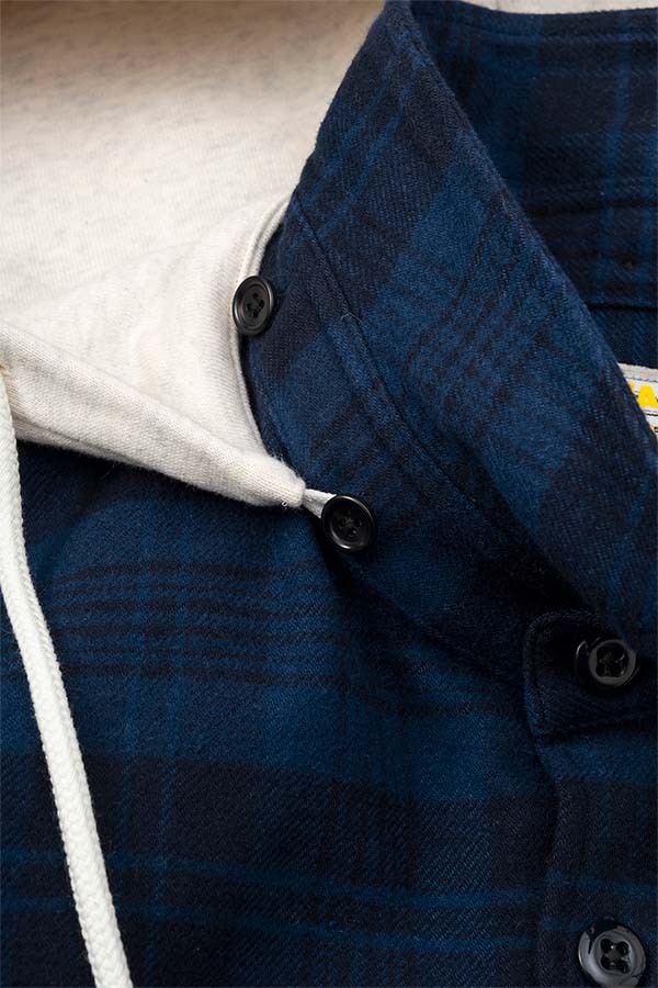 NAVYのチェックブルゾンに、取り外し可能なオートミールカラーのフードの付いたデザイン。DIGAWELのHoodie Shirtとは違い、フロントには大きめのポケット追加。