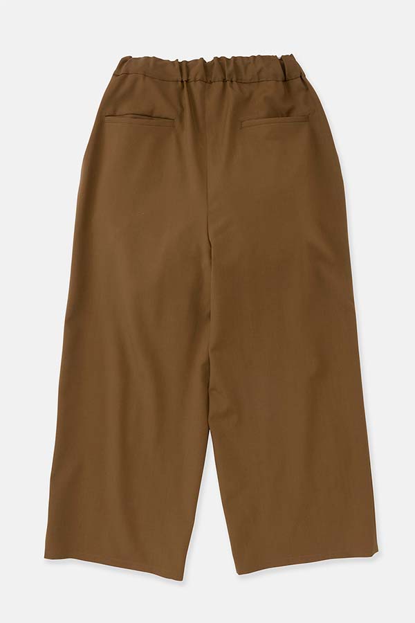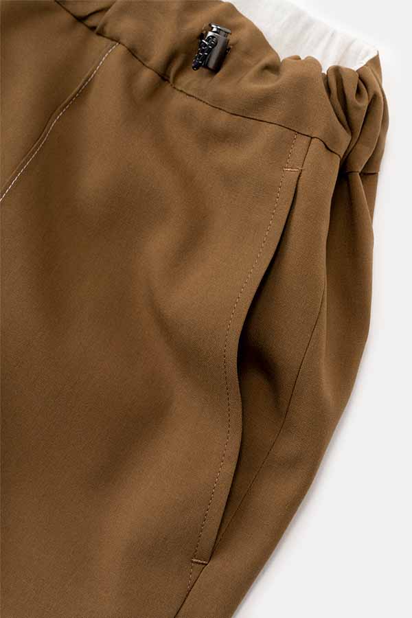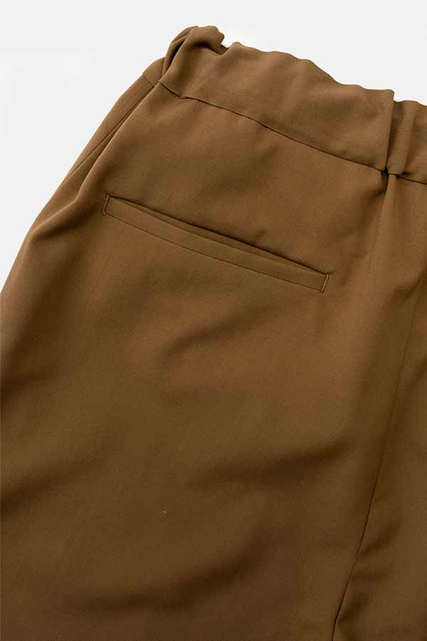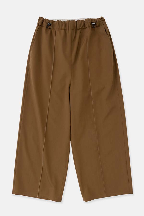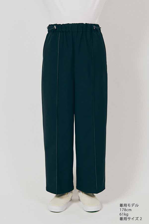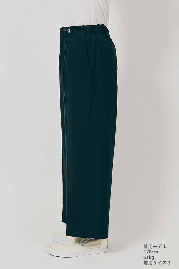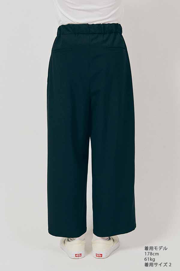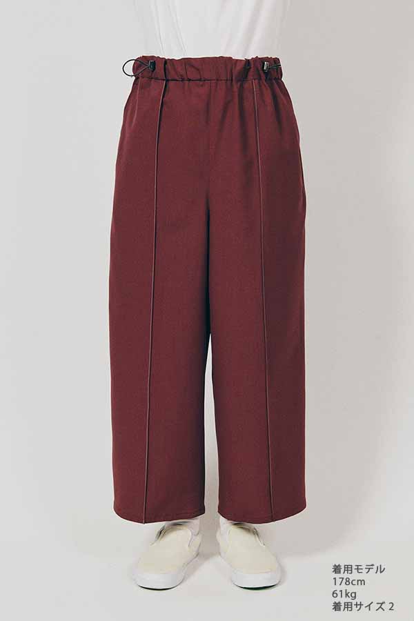 ウールポプリン.ウエストゴム仕様.スピンドルをストッパーにて調節.センタープレスラインにステッチ.裏地なし.ポケット2つ.ヒップポケット2つ.短めフルレングス.