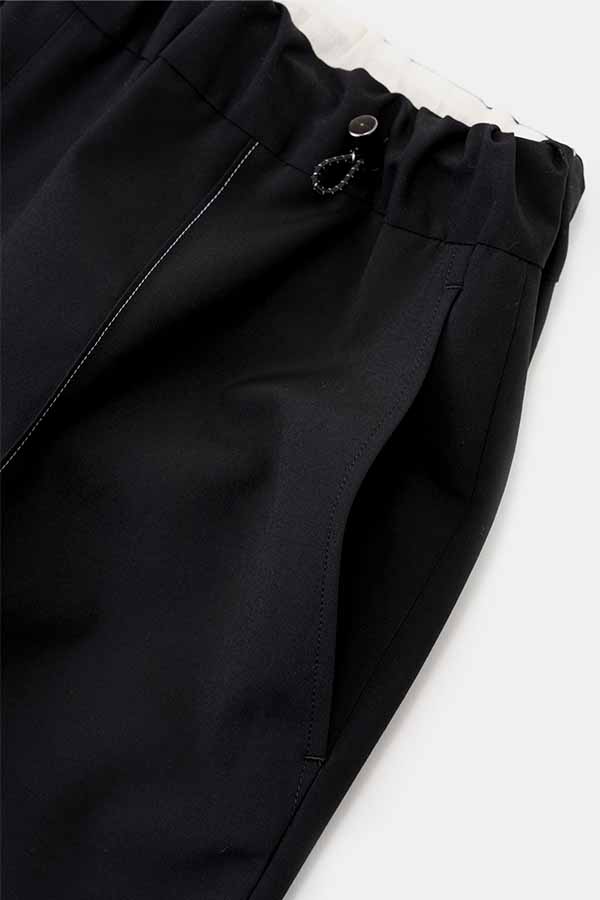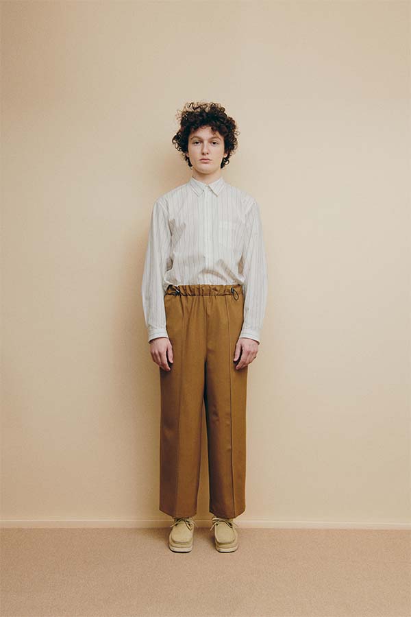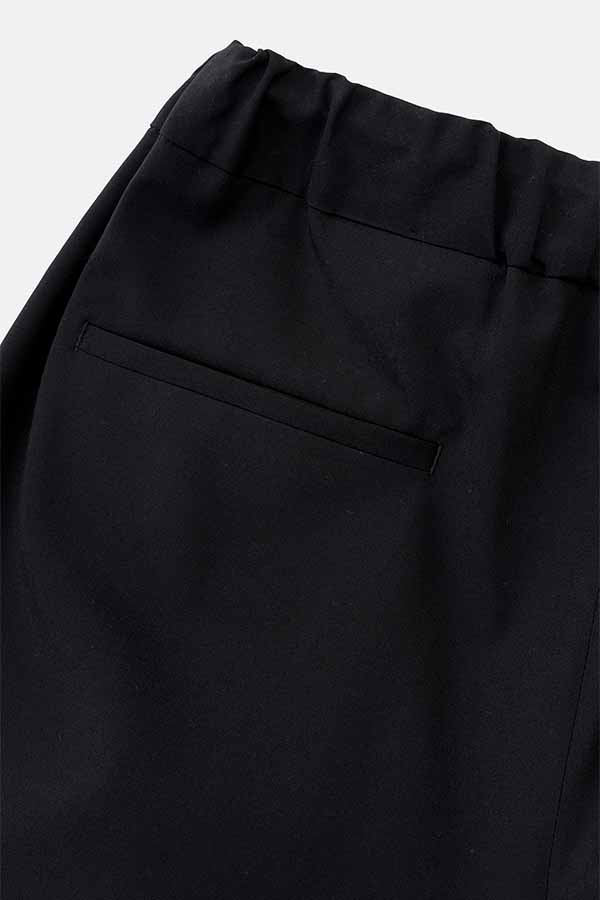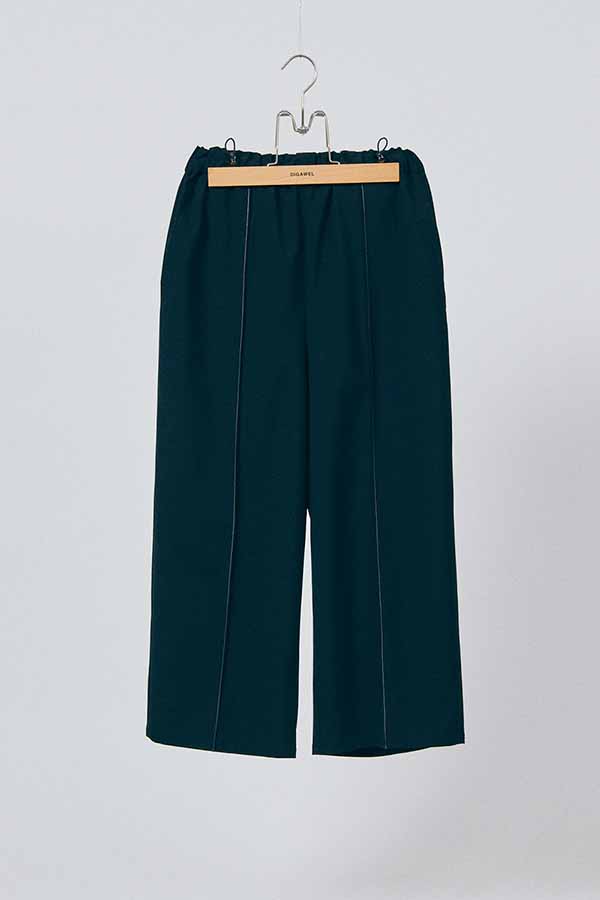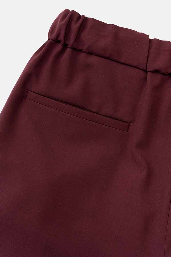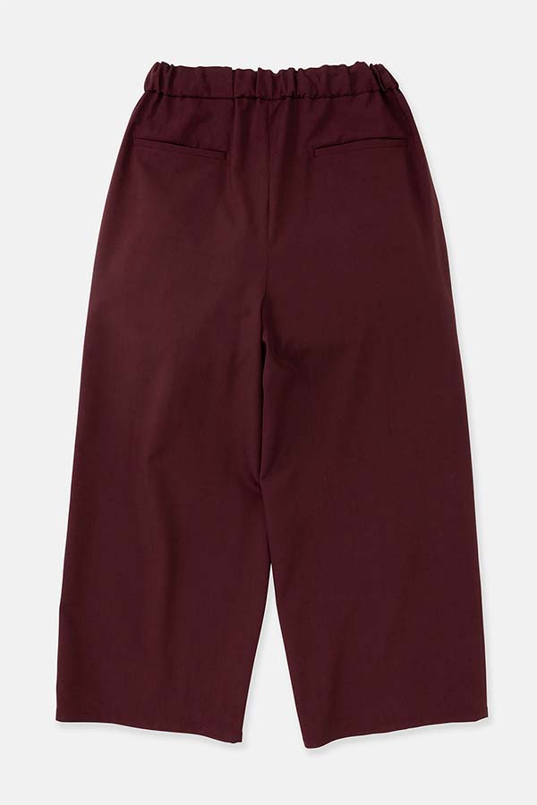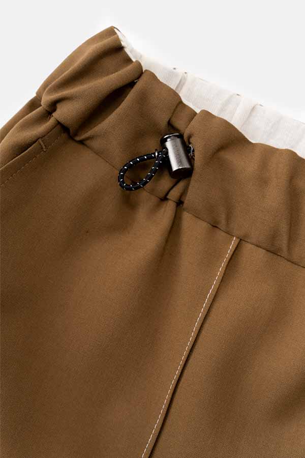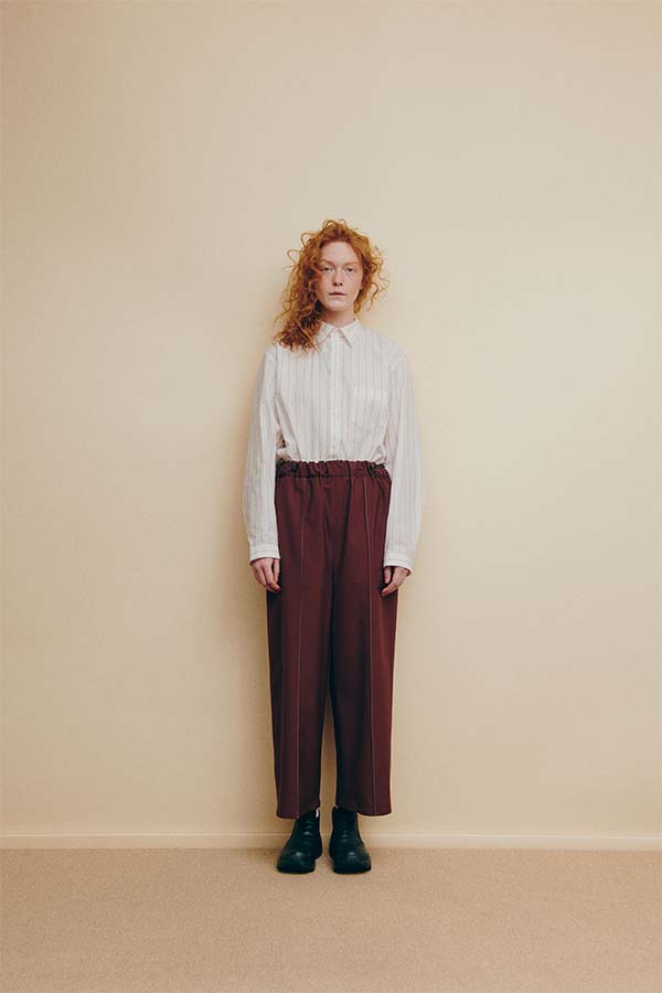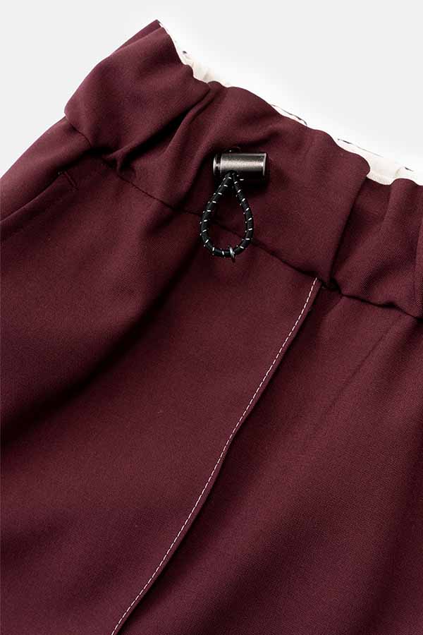 ウールポプリン.ウエストゴム仕様.スピンドルをストッパーにて調節.センタープレスラインにステッチ.裏地なし.ポケット2つ.ヒップポケット2つ.短めフルレングス.