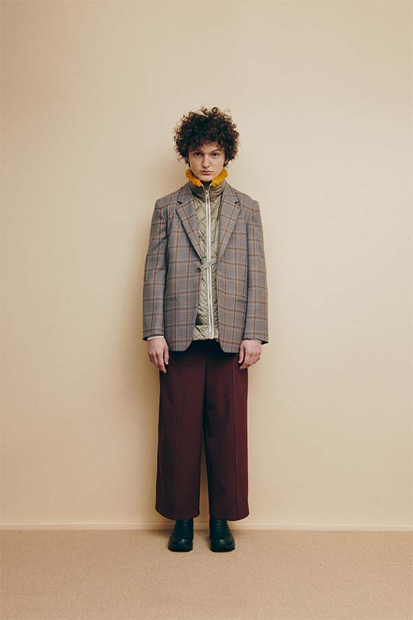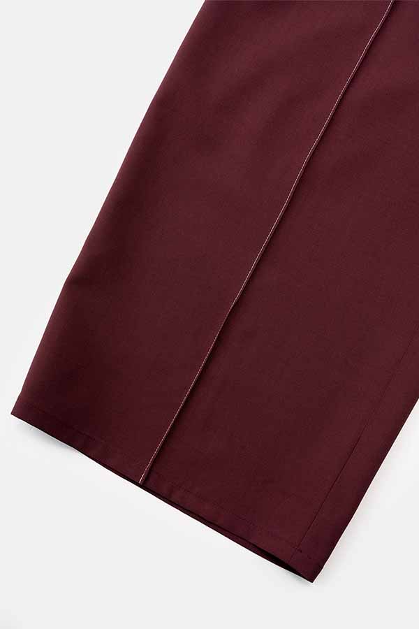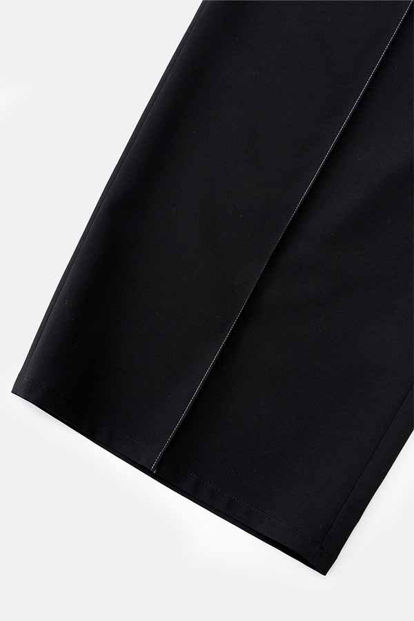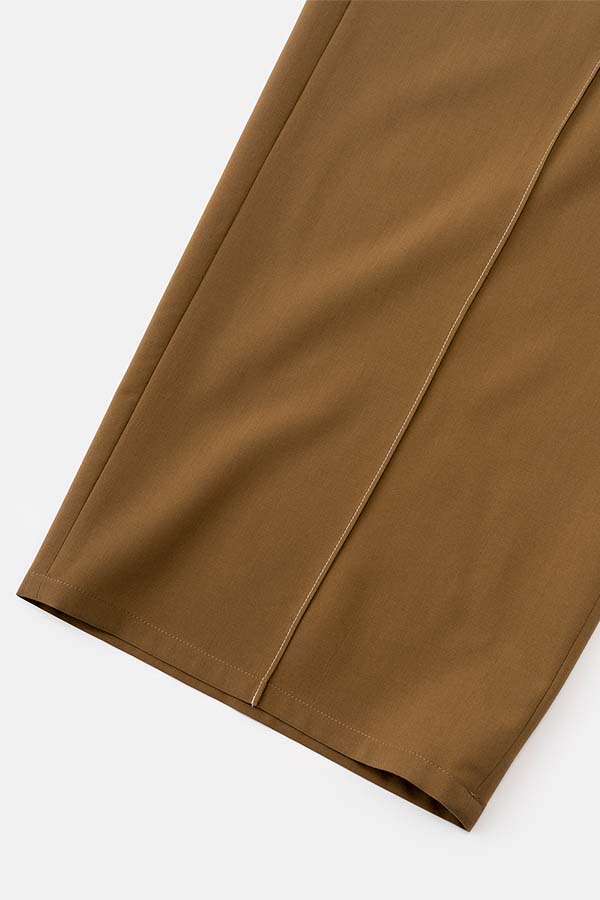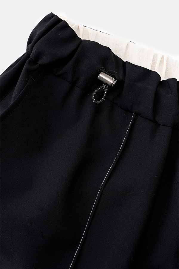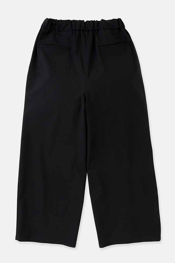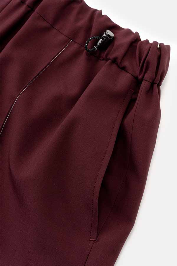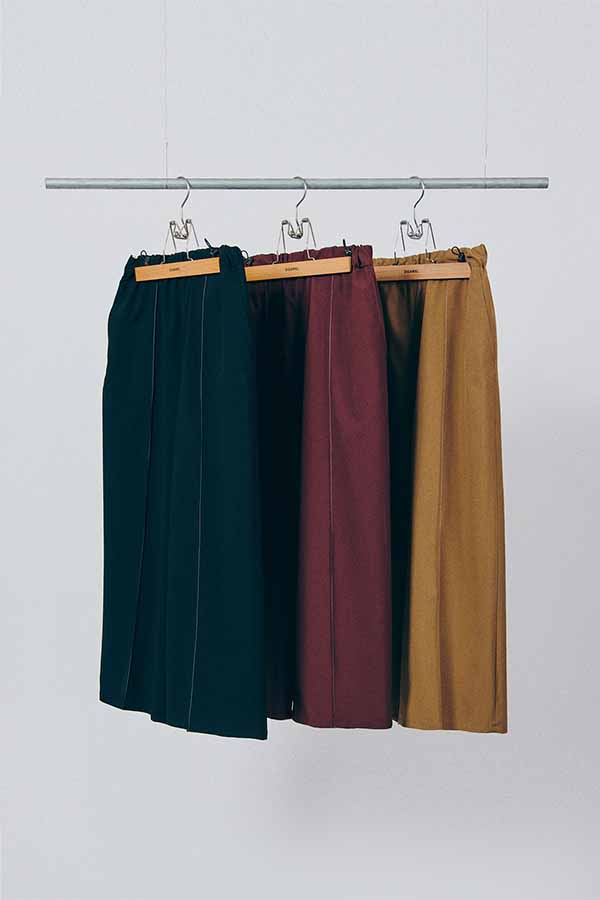 ウールポプリン.ウエストゴム仕様.スピンドルをストッパーにて調節.センタープレスラインにステッチ.裏地なし.ポケット2つ.ヒップポケット2つ.短めフルレングス.
