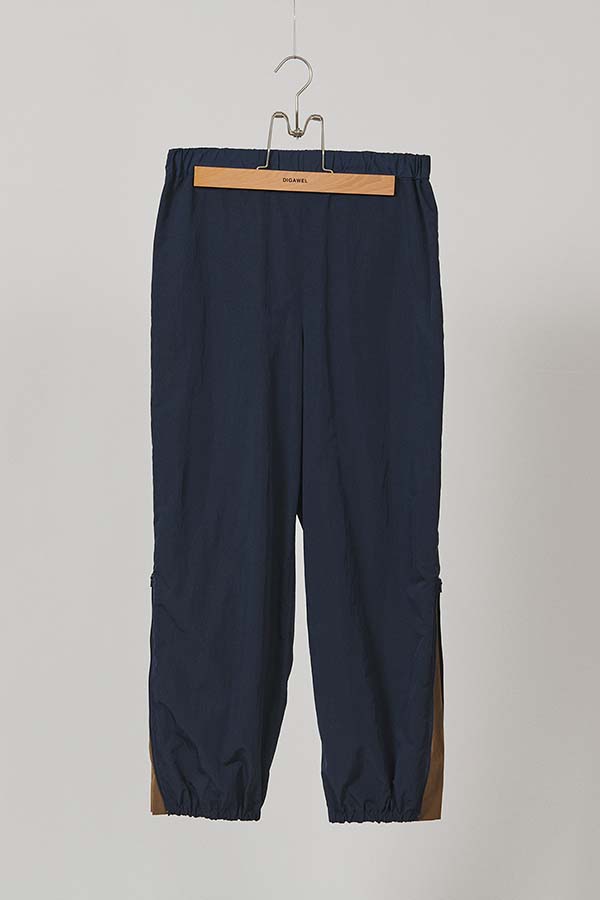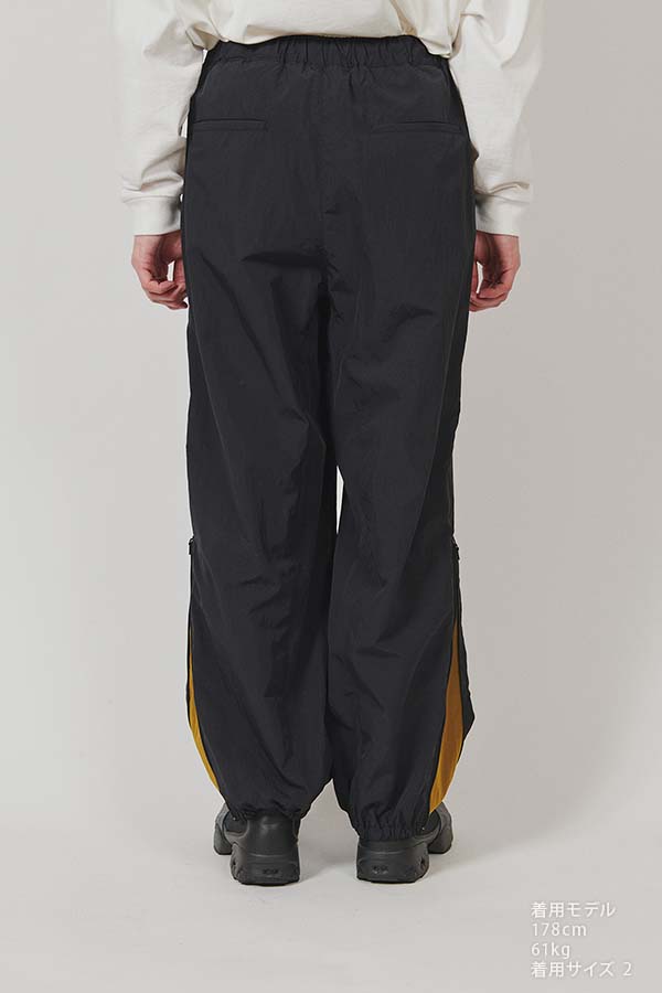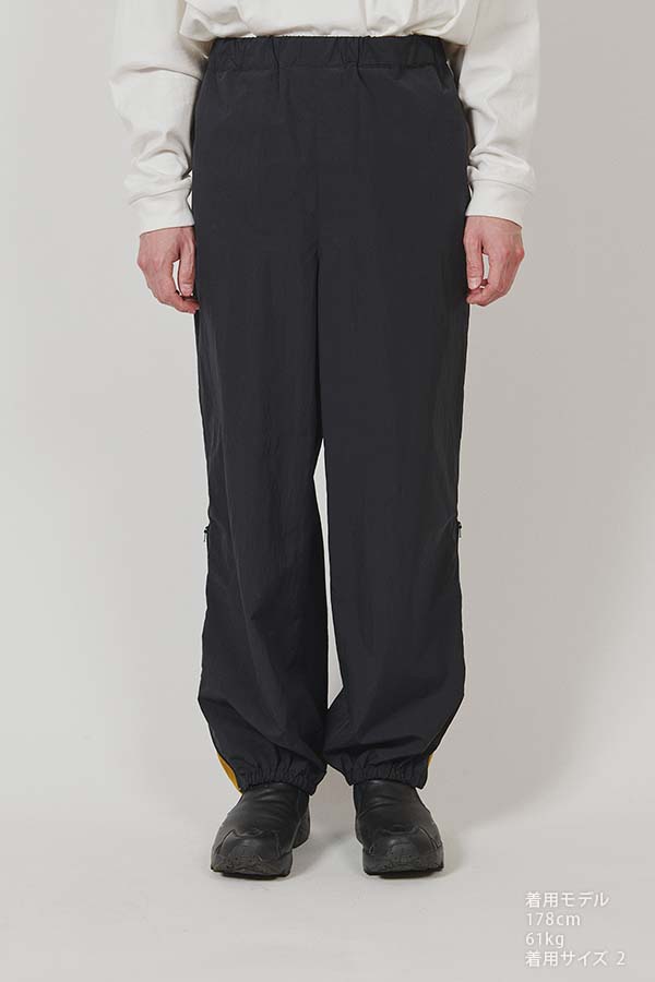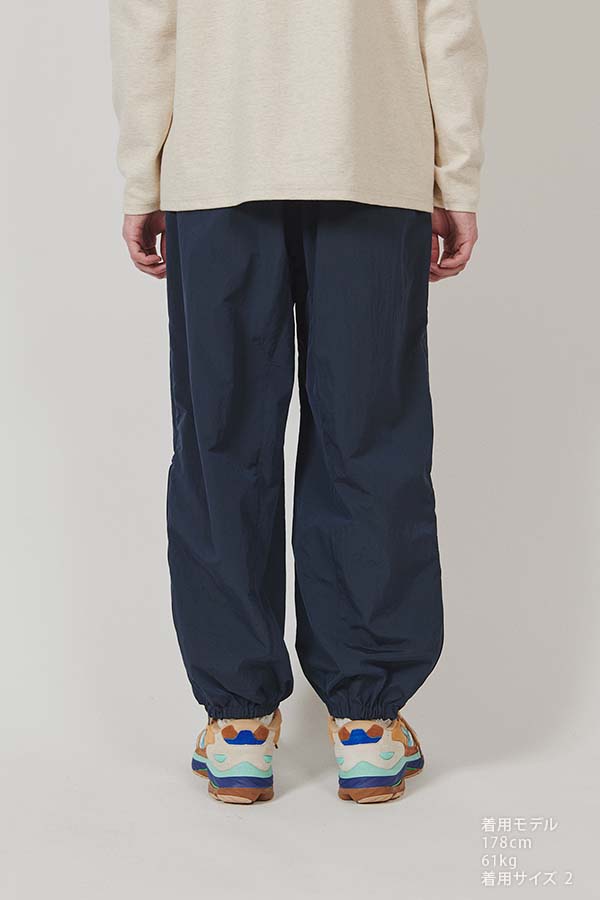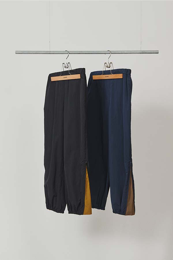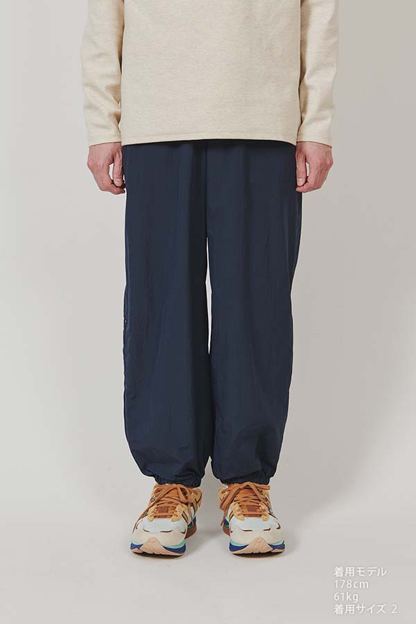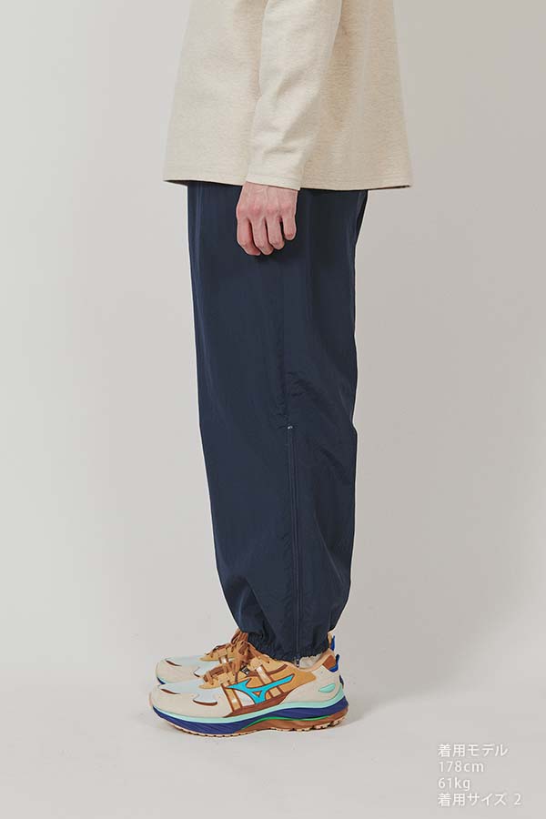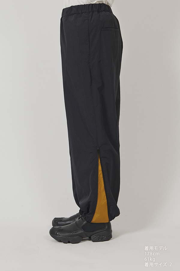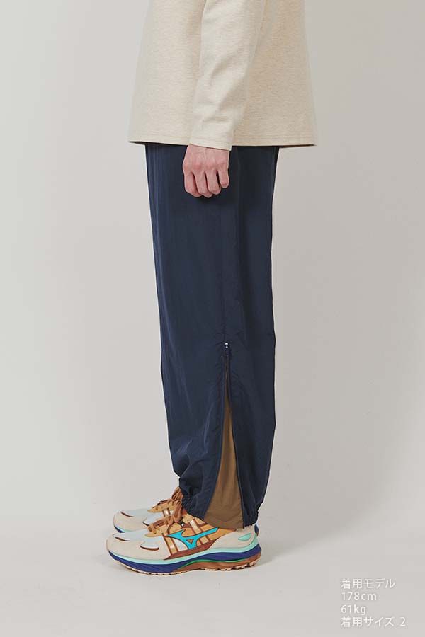 50dリサイクルナイロンタフタ.ウエストボタン留め.ファスナー開き.ウエストゴム.ガゼットクロッチ.裾脇線にファスナーと配色マチ.ポケット2つ.ヒップポケット2つ.フルレングス.