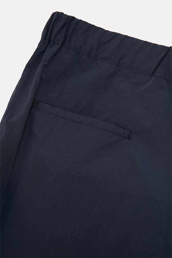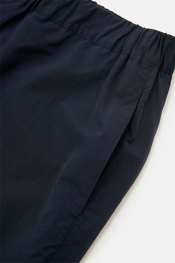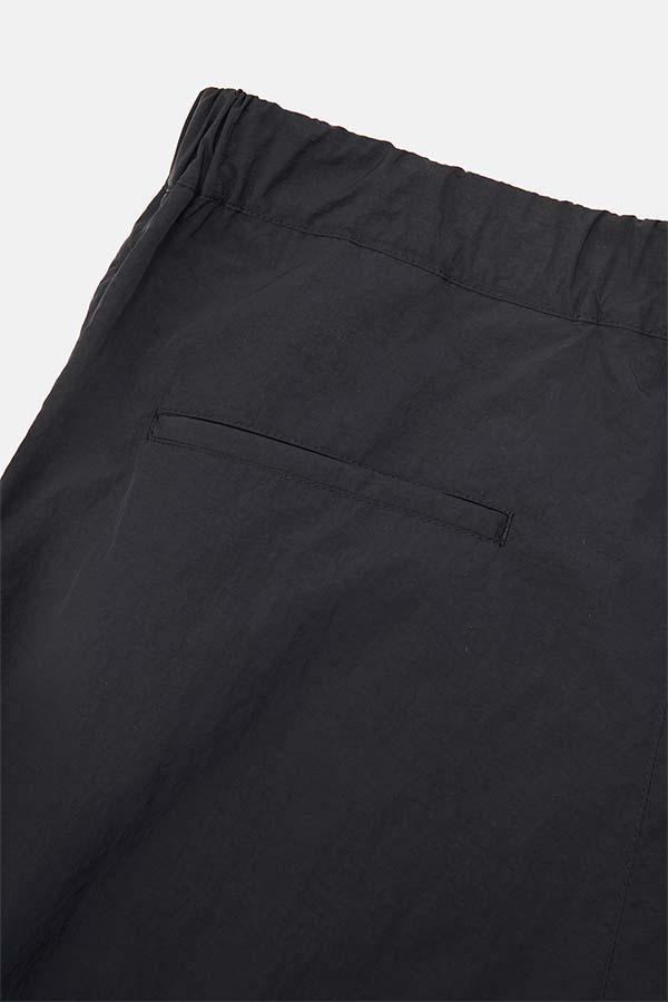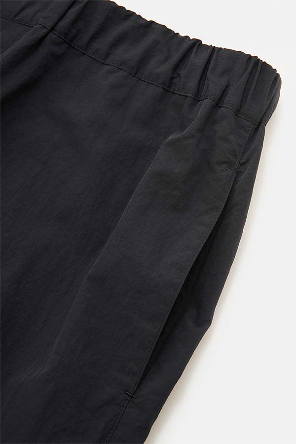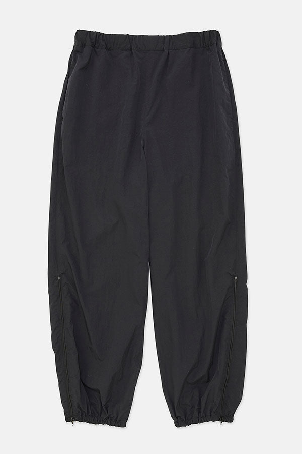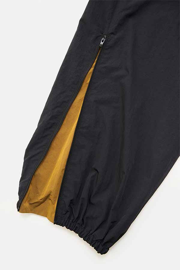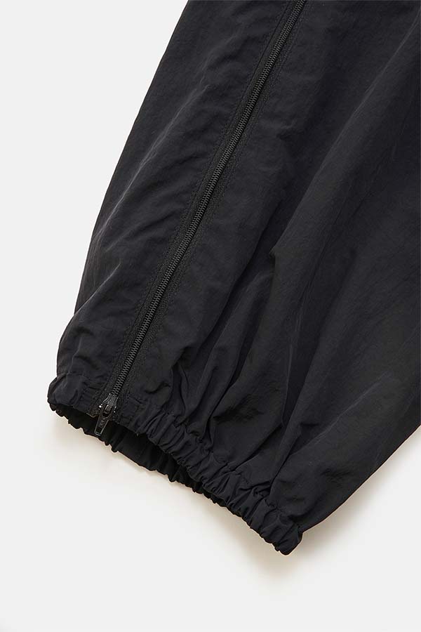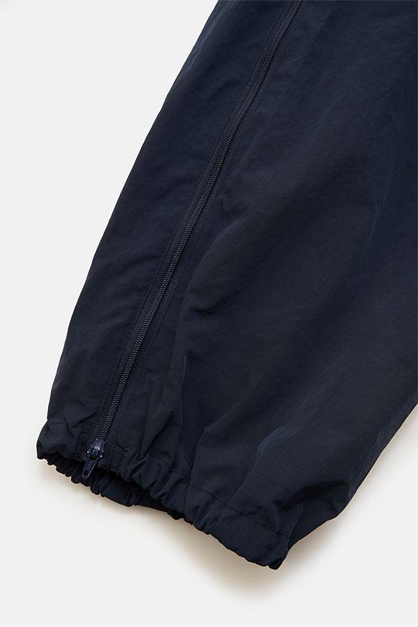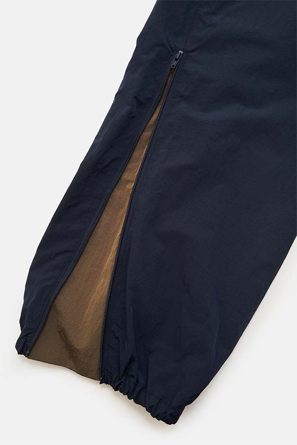 50dリサイクルナイロンタフタ.ウエストボタン留め.ファスナー開き.ウエストゴム.ガゼットクロッチ.裾脇線にファスナーと配色マチ.ポケット2つ.ヒップポケット2つ.フルレングス.