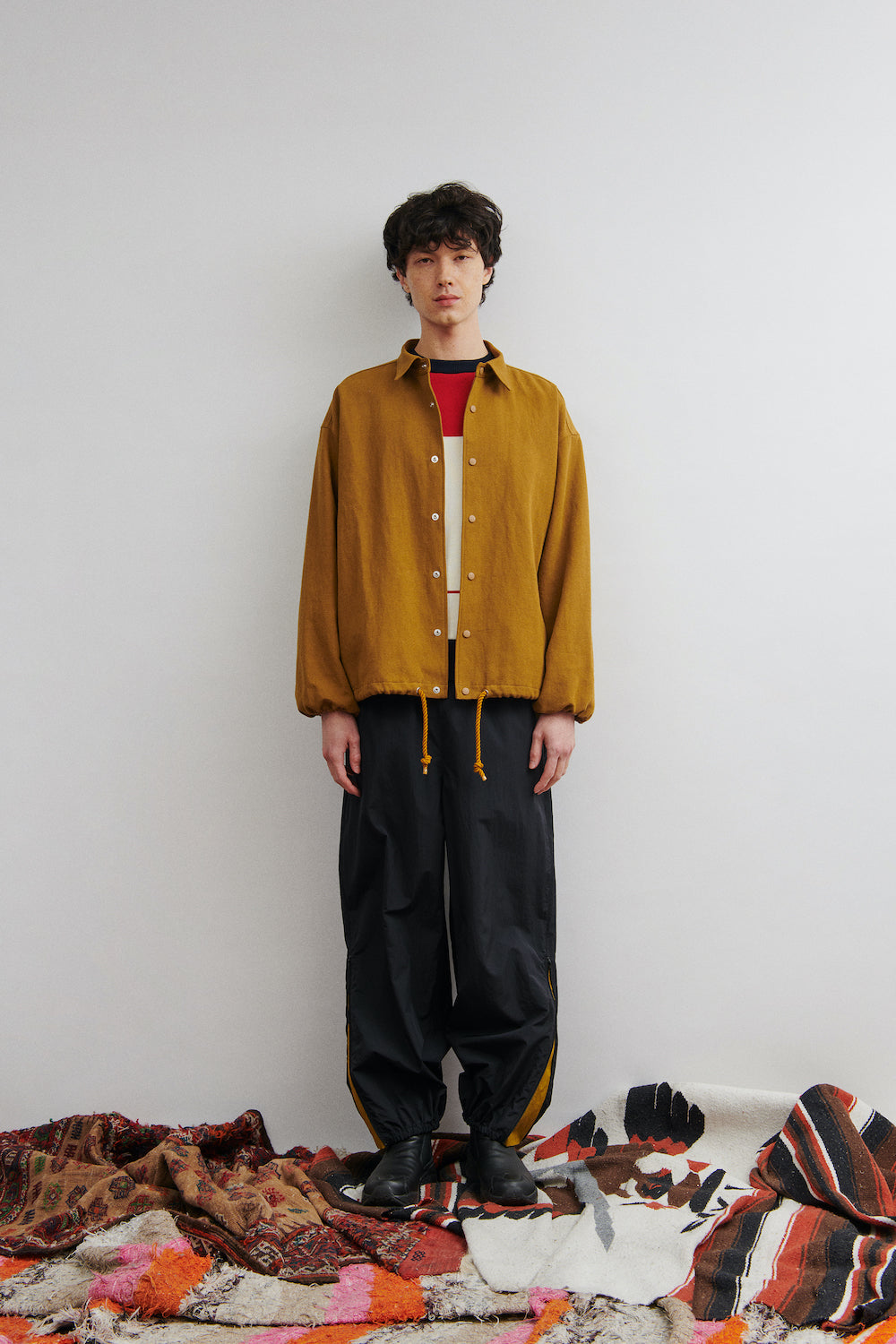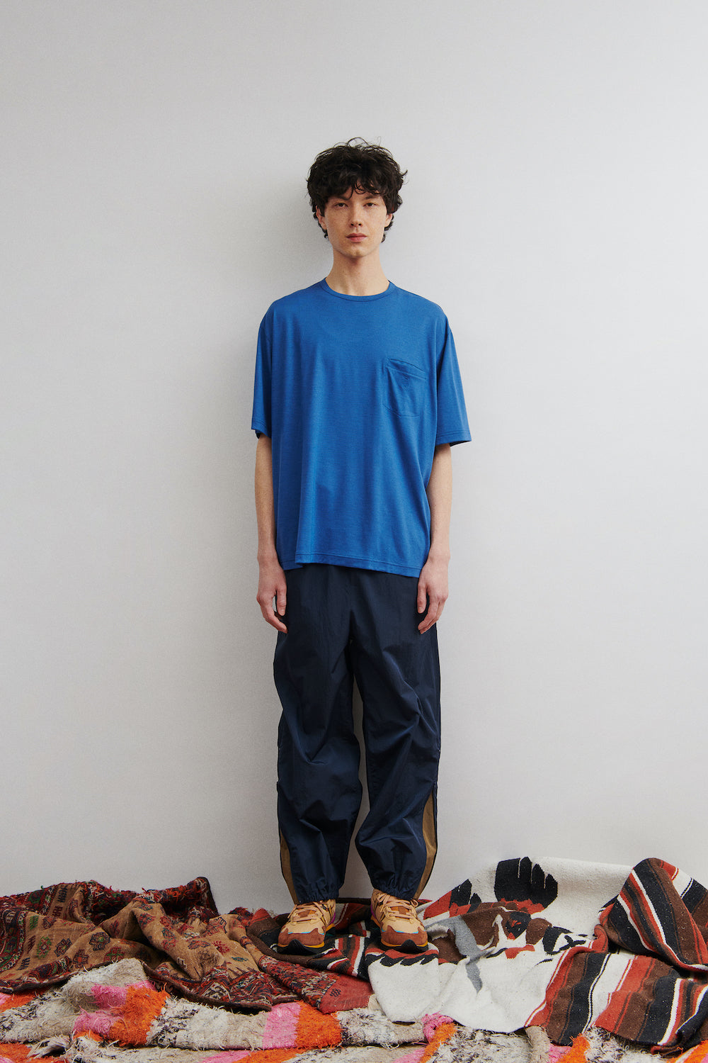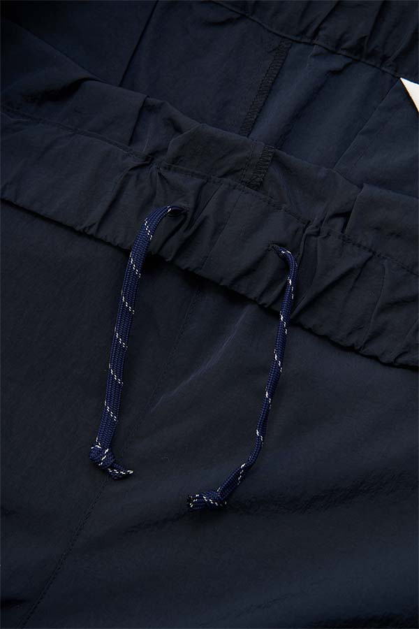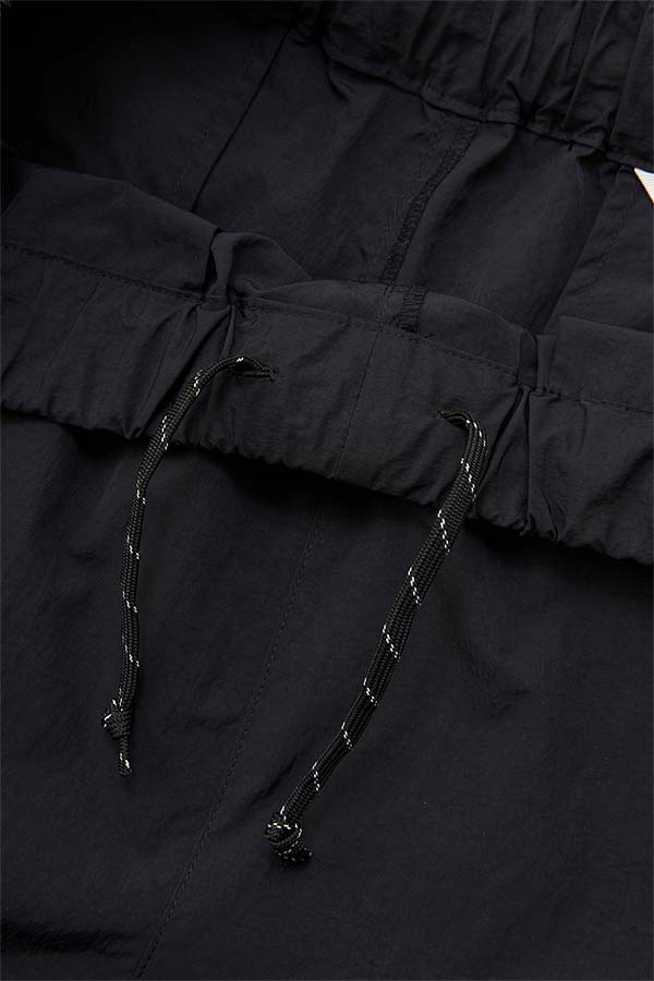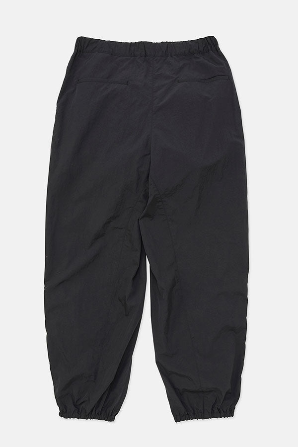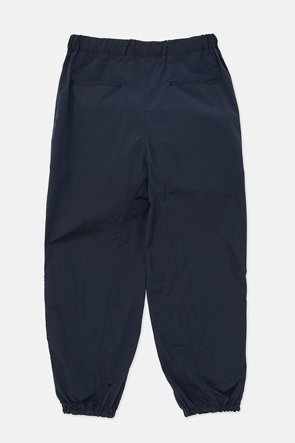 50dリサイクルナイロンタフタ.ウエストボタン留め.ファスナー開き.ウエストゴム.ガゼットクロッチ.裾脇線にファスナーと配色マチ.ポケット2つ.ヒップポケット2つ.フルレングス.